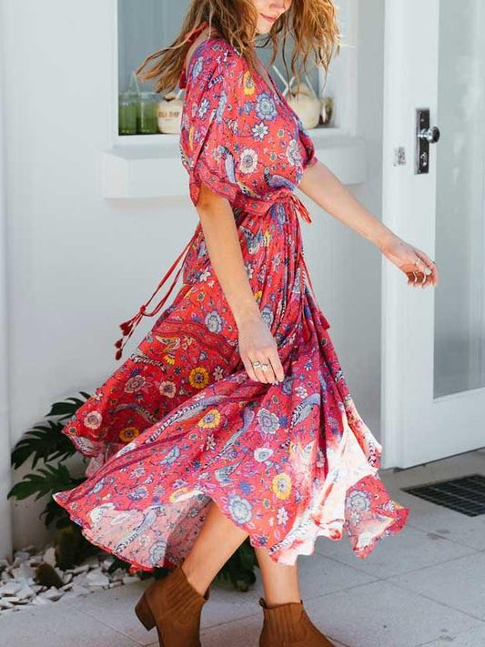 Bohemian Maxi Lotus Print V-Neck Long Dress
