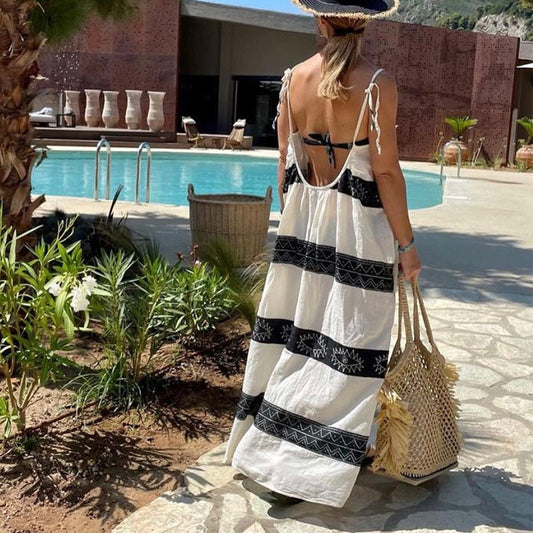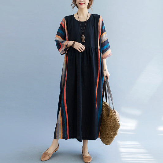 Vintage Vacation Style Long Dress with Loose Striped Patchwork Temperament Dress