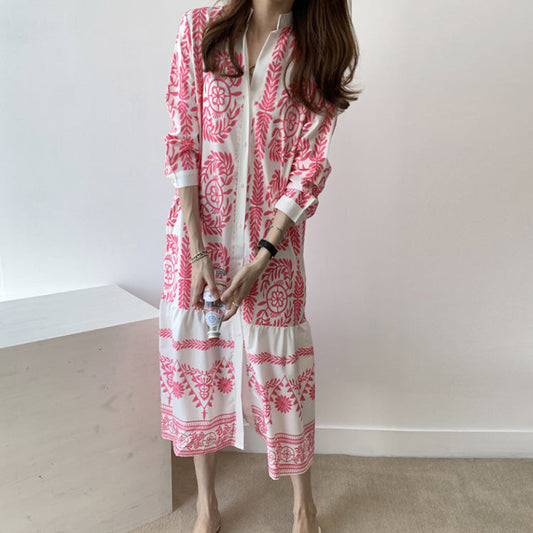 Summer Shirt Collar Print Ripple Large Swing Short Sleeved Dress Long Skirt