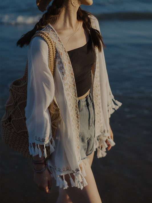 Ethnic Style Embroidery Bohemian Tassel Cardigan, Elegant and Super Immortal Sun Protection Shirt, Beach Outerwear, Loose and Thin Jacket