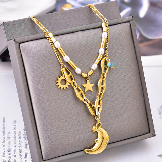 Good Night Moon Collar Chain Pearl Star Double Layer Pendant Necklace