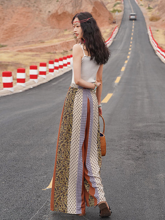 Bohemian ethnic wind and snow spinning split wide leg vacation beach pants summer high waisted pants