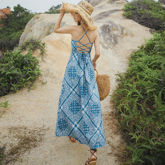 Women's summer new lace-up backless slip dress vintage blue midi vacation dress