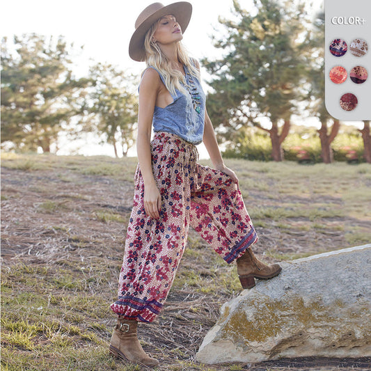 Women's loose print suspenders vintage casual cotton linen jumpsuit