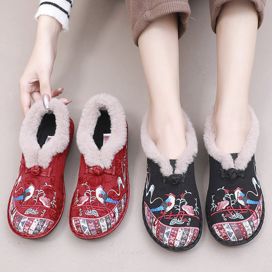 Women's Vintage Embroidery Ethnic Style Women's Warm keeping Cotton Shoes Middle aged and Old Aged Thick velvet Mother's Shoes Cotton Boots