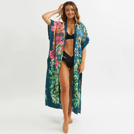 Polyester green printed beach blouse sexy cardigan loose sun protection bikini blouse