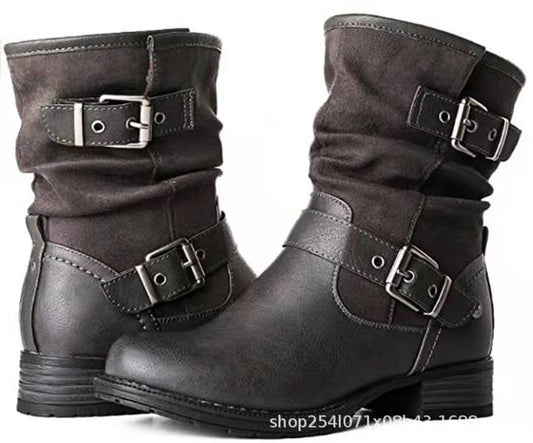 Autumn and winter new leopard print high round toe knight boots belt buckle low heel Martin boots