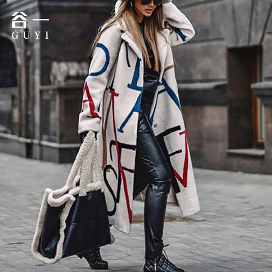 Coat Women's Long Sleeve Lapel Letter Print Fashion Wool Thermal Coat