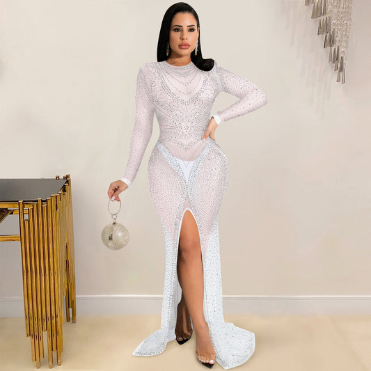 Hot drill women's mesh see-through long-sleeved slit dress women