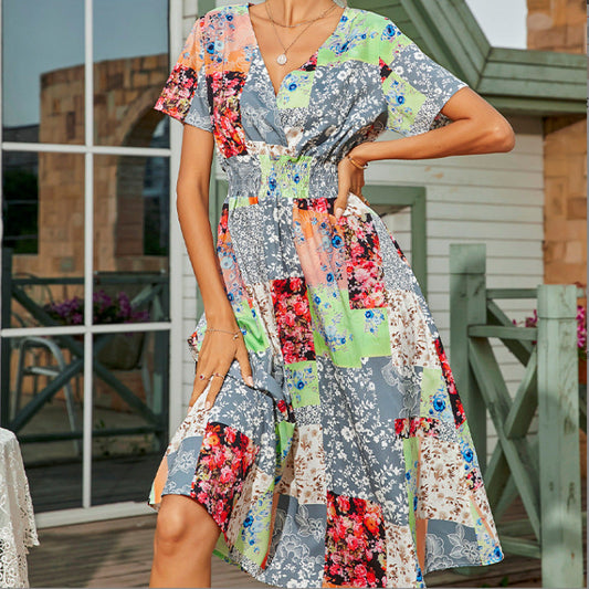Women's V-Neck Sexy French Beach Boho Print Dress