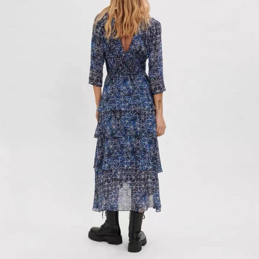 French Print Cake Skirt Temperament Flowing Halter Layered Dress