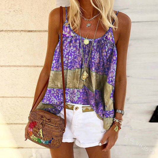 Fashion casual camisole women loose print ethnic style beach camisole T-shirt