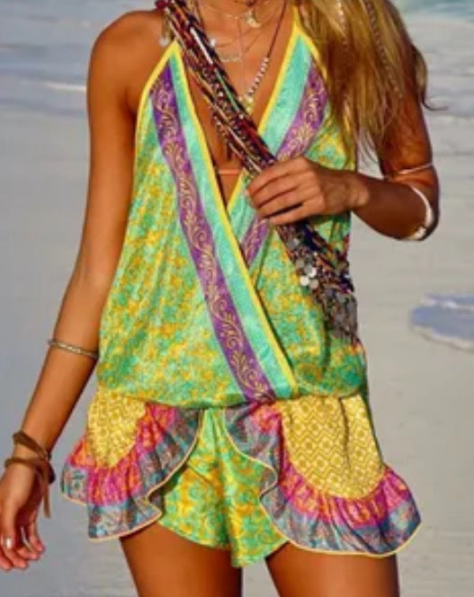 Summer Print Sweet Ruffle Deep V Neck Jumpsuit Women Summer Sexy Beach Casual Jumpsuit