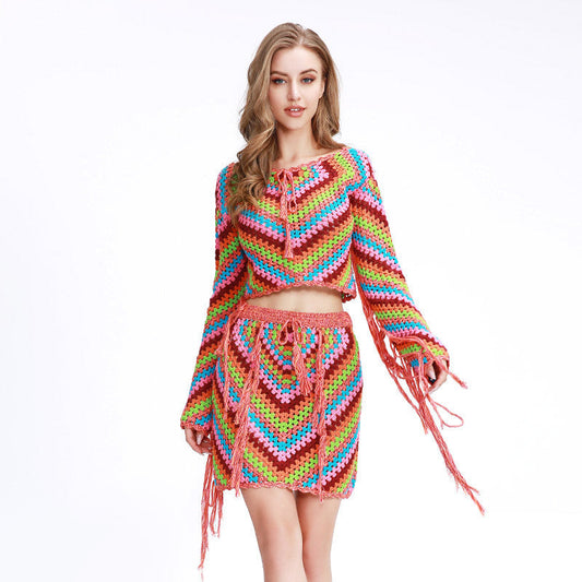 Long Sleeve Top Women Fashion Short High Waist Tassel Hand Crochet Swimsuit Cover Up Simple Beach Swimwear
