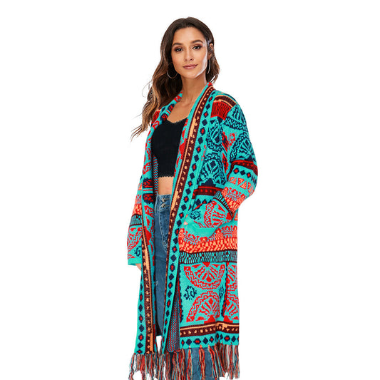 Ethnic retro tassel cardigan sweater knitted coat new loose long sleeve bohemian style