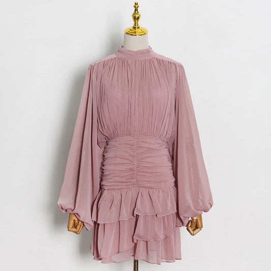 Small floral printed short skirt pleated slim small stand collar high waist stitching dress