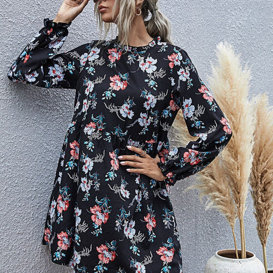 Black background small collar fashion leisure high waist A-line skirt temperament autumn and winter dress women's long sleeves