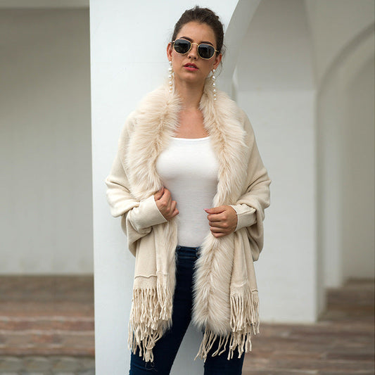 Tassel cloak shawl wool collar cloak solid color cardigan sweater
