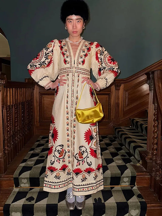 Women Flax Flower Print Maxi Boho Dress Vintage Street V Neck Lantern Sleeve Single Breasted Vestidos Lady Vacation Loose Robes