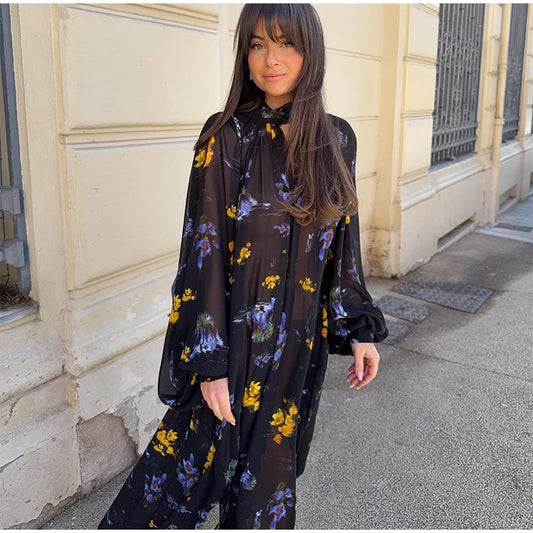 Elegant Printed Boho Long Dresses Women Loose Chic Turtleneck Lantern Sleeve Floral Robes 2025 Spring Summer Lady Vacation Dress
