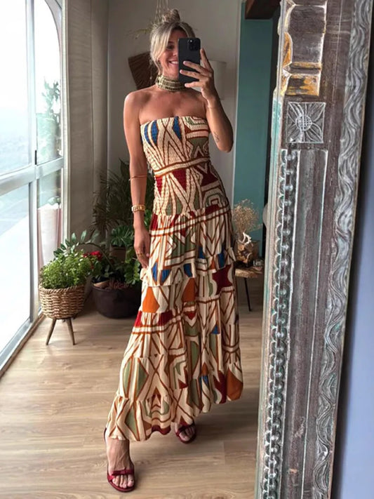 Beach Printed Bikini Skirts Set Women's Sexy Backless Sleeveless Lace-up Swimwear Long Skirt 2025 Summer New Lady Vacation Suit