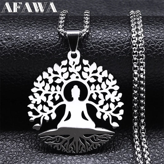 Buddhism Meditation Buddha Yoga Pendant Necklace Stainless Steel Tree of Life Buddhist Chakras Reiki Chain Jewelry collar
