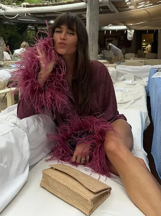 Shiny Feather Patchwork Solid Shirt For Women Chic Stand Collar Single-breasted Long Sleeve Tops 2024 Lady Holiday Beach Coats