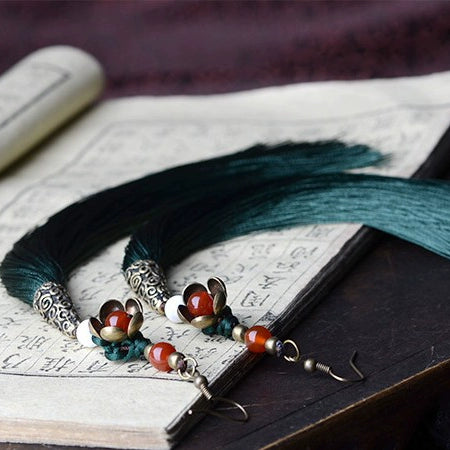 Ethnic Style Super Long Dark Green Fringed Earrings Exaggerated Earrings