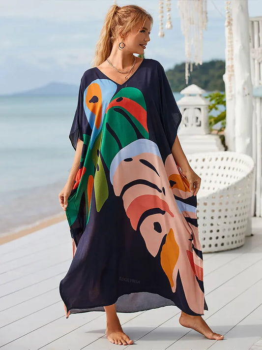 2024 Boho Printed Kaftan Summer Clothing Women Plus Size V-Neck Batwing Sleeve Beachwear Cover-ups Maxi Dress Robe Sarong Q1476