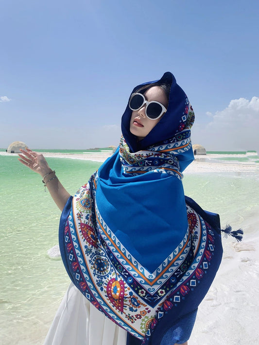 Ethnic Style Shawl Blue Seaside Beach Towel Thin Silk Scarf