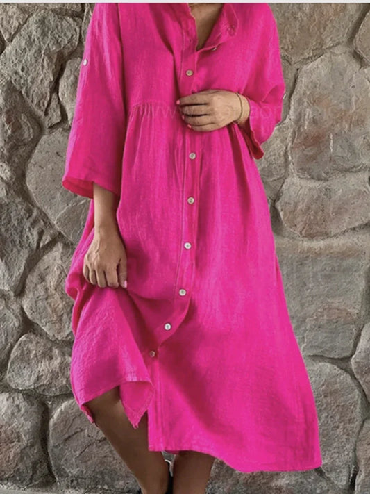 Women Causal Cotton Linen Dress Fashion Loose Button Up Long Sleeve Shirt Dresses Vintage Solid Beach Party Midi Dress Robe