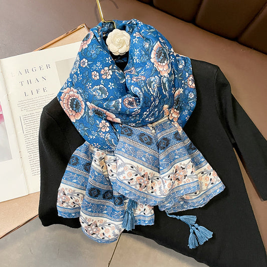 Ethnic Style Spring and Autumn New Blue Cotton Hemp Feel Thin Scarf with Flower Splice Fragmented Flower Retro Versatile Shawl