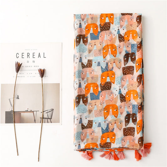 New Spring and Summer Fresh and Sweet Cartoon Cat Cotton and Hemp Scarf Balinese Thin Scarf Shawl