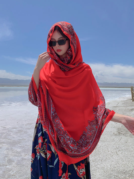 Red Ethnic Style Sunscreen Shawl Women's Summer Thin Style Wrapped with Silk Scarves, Beach Scarves