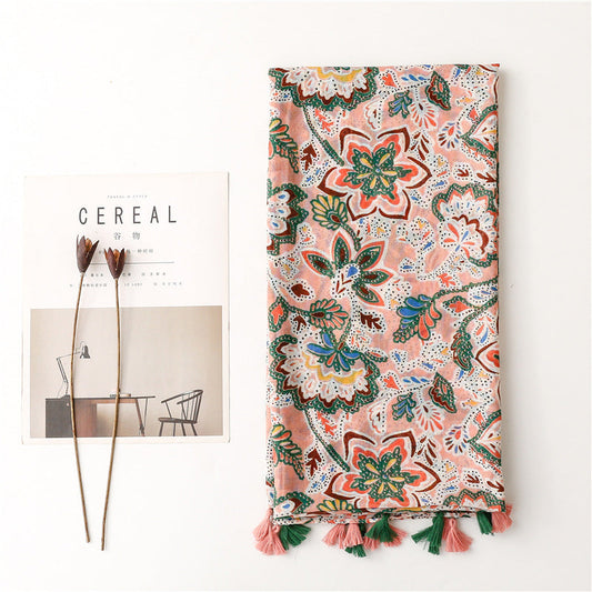 Bohemian Ethnic Style Sunscreen Shawl Spring/Summer Thin Silk Scarf Balinese Flower Totem Tassel Scarf