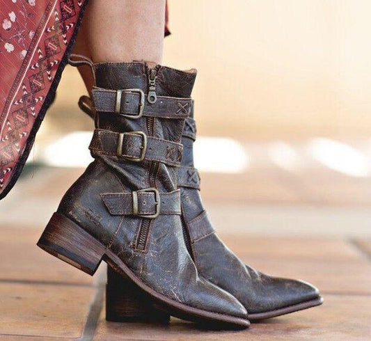 Autumn Winter Woman Mid-Calf PU Leather Round Toe Shoes Low Heel Rivet Cool Motorcycle Boots