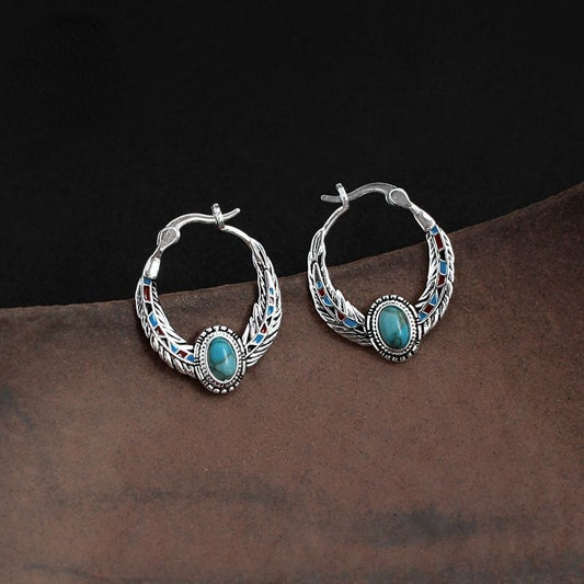 Blue 925 Silver Vintage Ethnic Style Feather Enamel Turquoise Earring Literature Tibetan Earrings