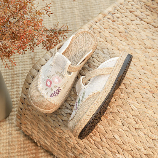 Summer New Ethnic Style Embroidered Slippers Women's Beef Tendon Bottom Cloth Shoes Women Hand-woven Linen Straw Shoes
