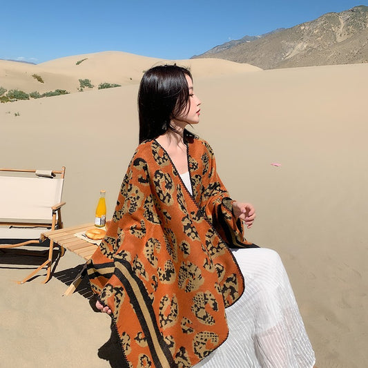 Ethnic Style Cape Coat Shawl Lhasa Scarf Female Leopard Pattern Autumn and Winter Grassland Scarf