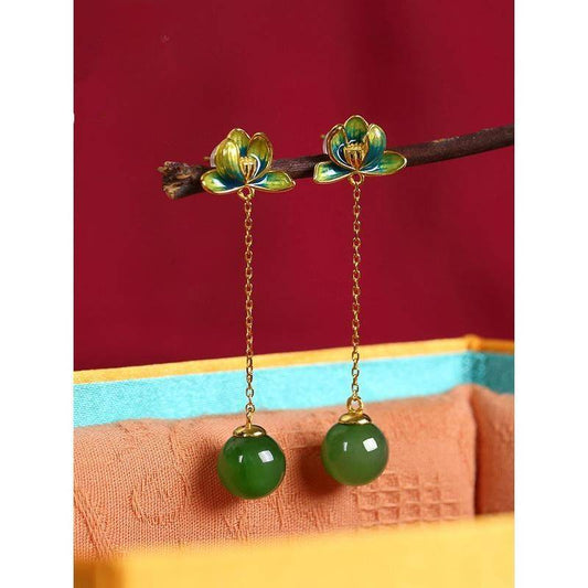Jasper Lotus Heart Tibetan Style Enamel Color Lotus 925 Silver Jade Earrings Women's Fringed Earrings