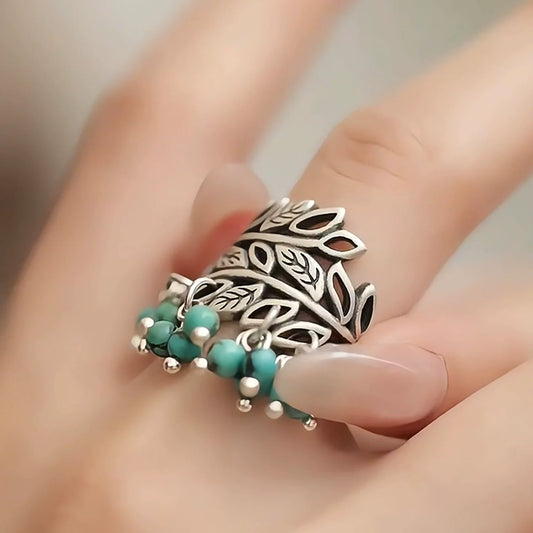 Silver New Retro Old Turquoise Fringed Ring Ethnic Style Tang Grass Flower Hollow Hammer Ring