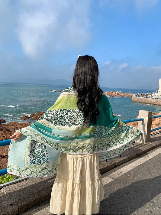 Fresh Green Ethnic Style Silk Scarf Women's Summer Sunscreen Dual-purpose Large Shawl Beach Towel Thin Cotton and Linen Scarf Yarn