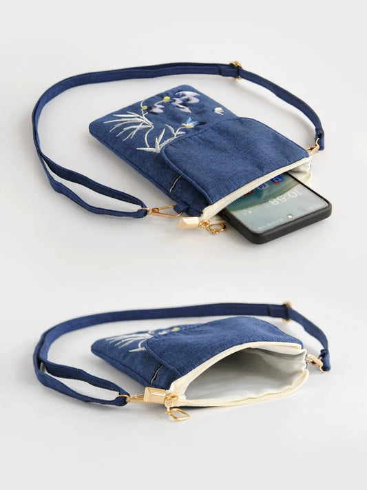 Embroidery Flower Bag Women's Cotton and Linen Cloth Messenger Bag Small Bag Change Bag Close-fitting Mobile Phone Bag Ethnic Style Mobile Phone Bag