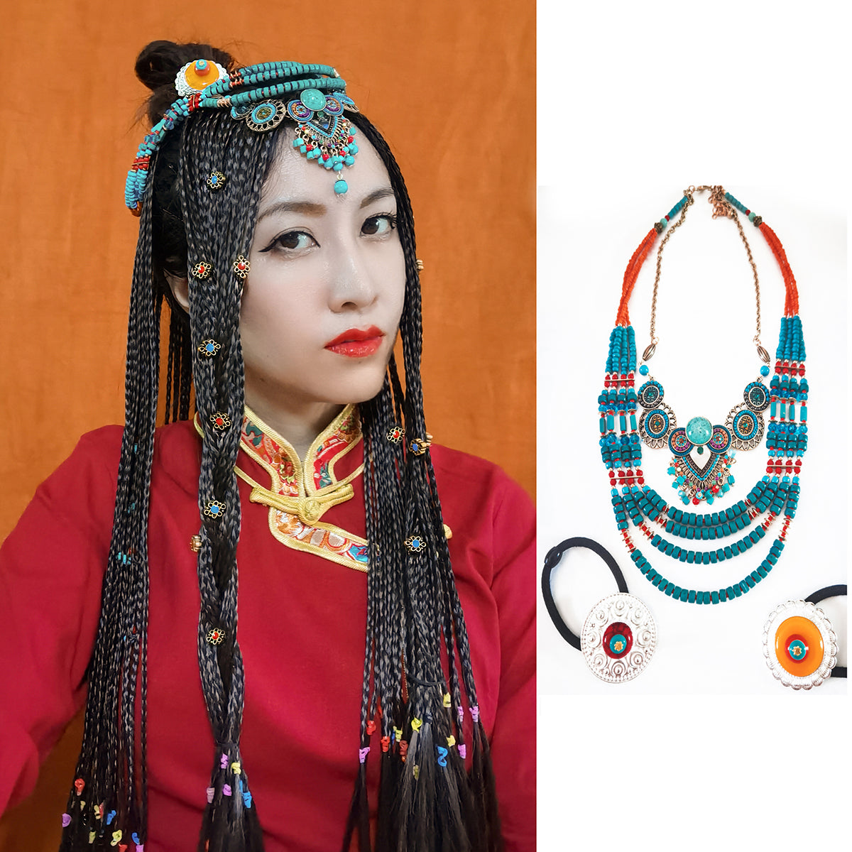 Ethnic Tibetan hair ornaments tiara headwear Bohemian blue-green multilayer beaded pendant headwear