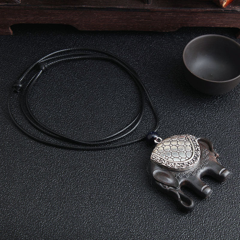 Versatile ethnic style retro black sandalwood elephant pendant with simple wax rope pendant
