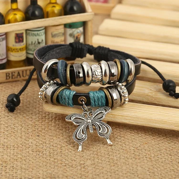 1PCS Fashion Women Men Vintage Multilayer Butterfly Wood Bead Leather Braided Strand Bracelet