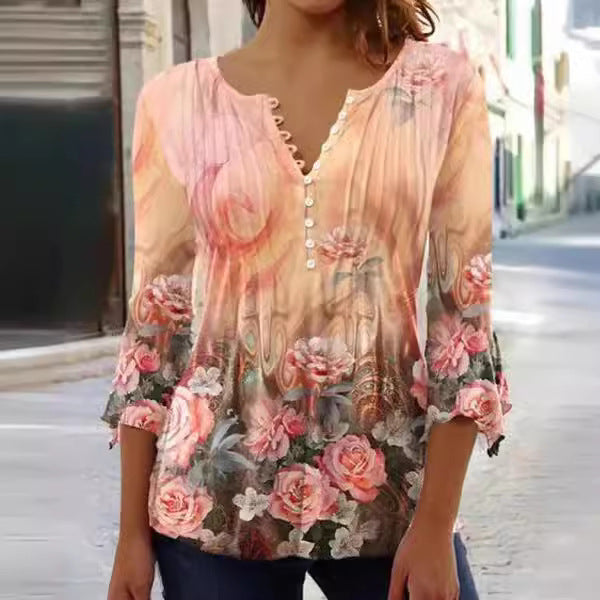 Spring and Summer Fashion New Women's Clothing Floral Printing V-neck Short-sleeved Pleated Button-up T-shirt Bottoming Shirt