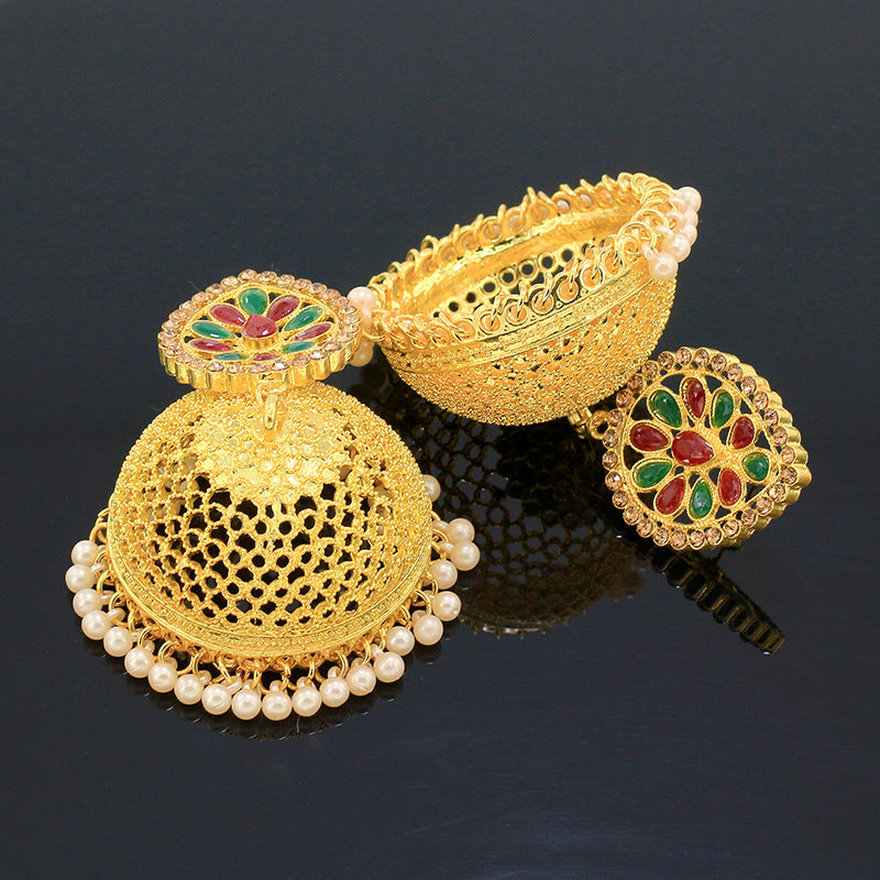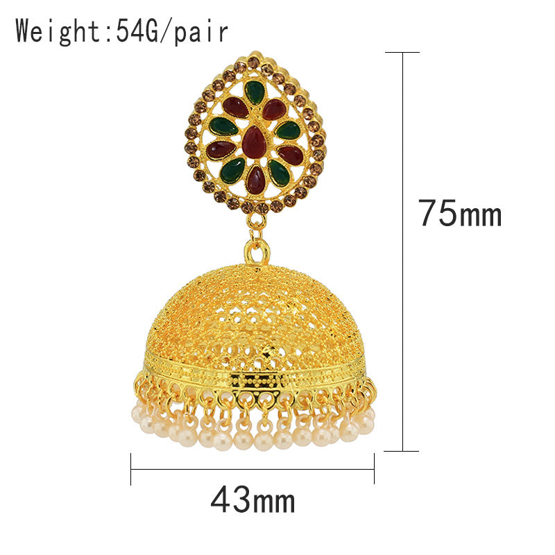 New Nepalese National Style Gold-plated Earrings Bell Pearl Earrings Inlaid with Colored Diamond Palace Retro Earrings