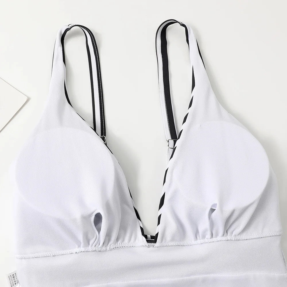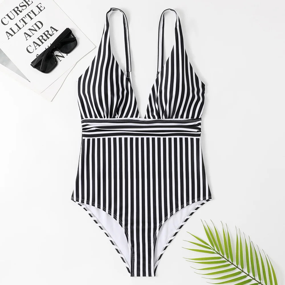 2023 New Striped One Piece Swimsuit Vintage Swimwear Women V-neck Bathing Swimming Suit Female Summer Beachwear Bodysuit
