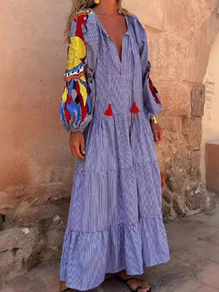2024 Autumn Fashion New Women's Loose Long Sleeve Striped Splicing V-neck Lantern Sleeve Printed Loose Long Dress